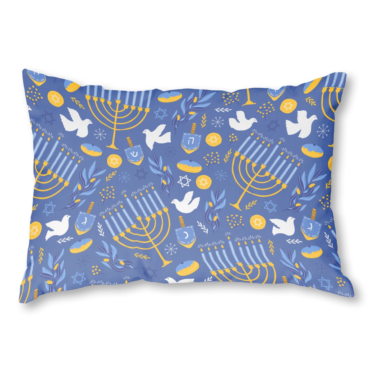 A festive, repeating pattern celebrating Hanukkah on a blue background. The design features illustrations of menorahs, dreidels, sufganiyot (doughnuts), Stars of David, and white doves in a cheerful yellow, blue, and white color palette, creating a joyful holiday theme.