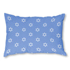A seamless pattern features white Stars of David, a well-known symbol of Judaism, arranged in an orderly grid against a solid blue background.