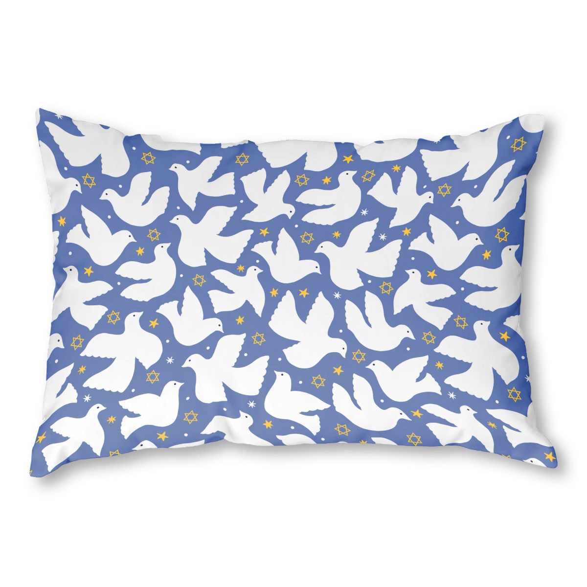 A seamless pattern of stylized white doves flying against a blue background. The design is scattered with yellow Stars of David and smaller stars, creating a symbolic and peaceful motif with Jewish themes.