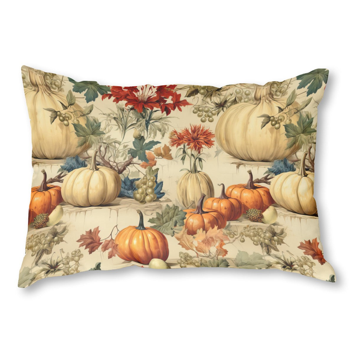 A vintage-style illustration of a bountiful autumn harvest. Orange and pale pumpkins, grapes, and colorful foliage are arranged on tiered stone ledges, creating a rich, decorative pattern with a classic, botanical feel.