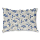 The image displays a seamless pattern of stylized blue roses on a beige background. The roses are densely clustered on thorny stems, with some buds and leaves interspersed. The background has a subtle linen-like texture. The overall style is reminiscent of classic floral toile patterns, suggesting a sophisticated and perhaps slightly traditional aesthetic.