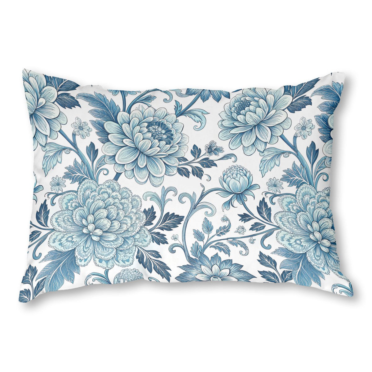 An elegant, seamless floral pattern in shades of blue on a white background. The design features large, stylized peonies or chrysanthemums with intricate linework, interwoven with scrolling vines and leaves, creating a classic, decorative look reminiscent of traditional porcelain.