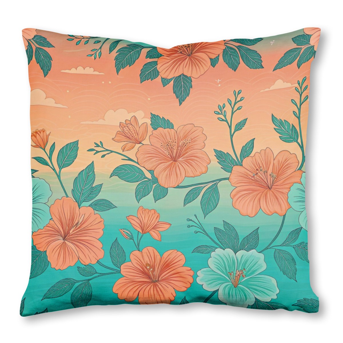A vibrant, retro-style pattern of orange and teal hibiscus flowers with dark green leaves. The background is a stylized sunset gradient, shifting from warm orange to cool turquoise, with subtle clouds creating a serene, tropical atmosphere.