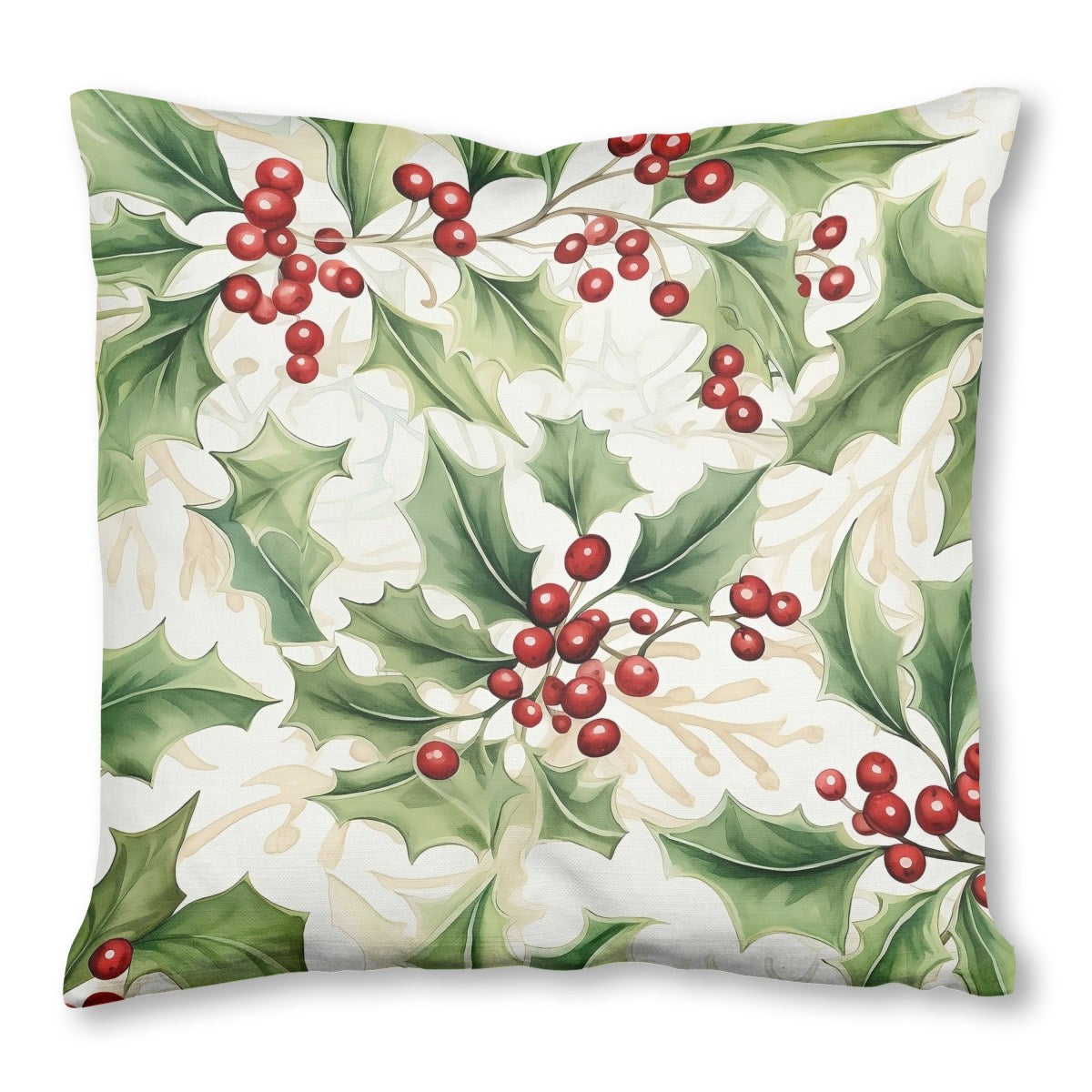 This is a seamless watercolor pattern of festive holly. The design features sprigs with spiky green leaves and clusters of bright red berries, layered over a light background with faint silhouettes of leaves, creating an elegant, classic holiday feel.