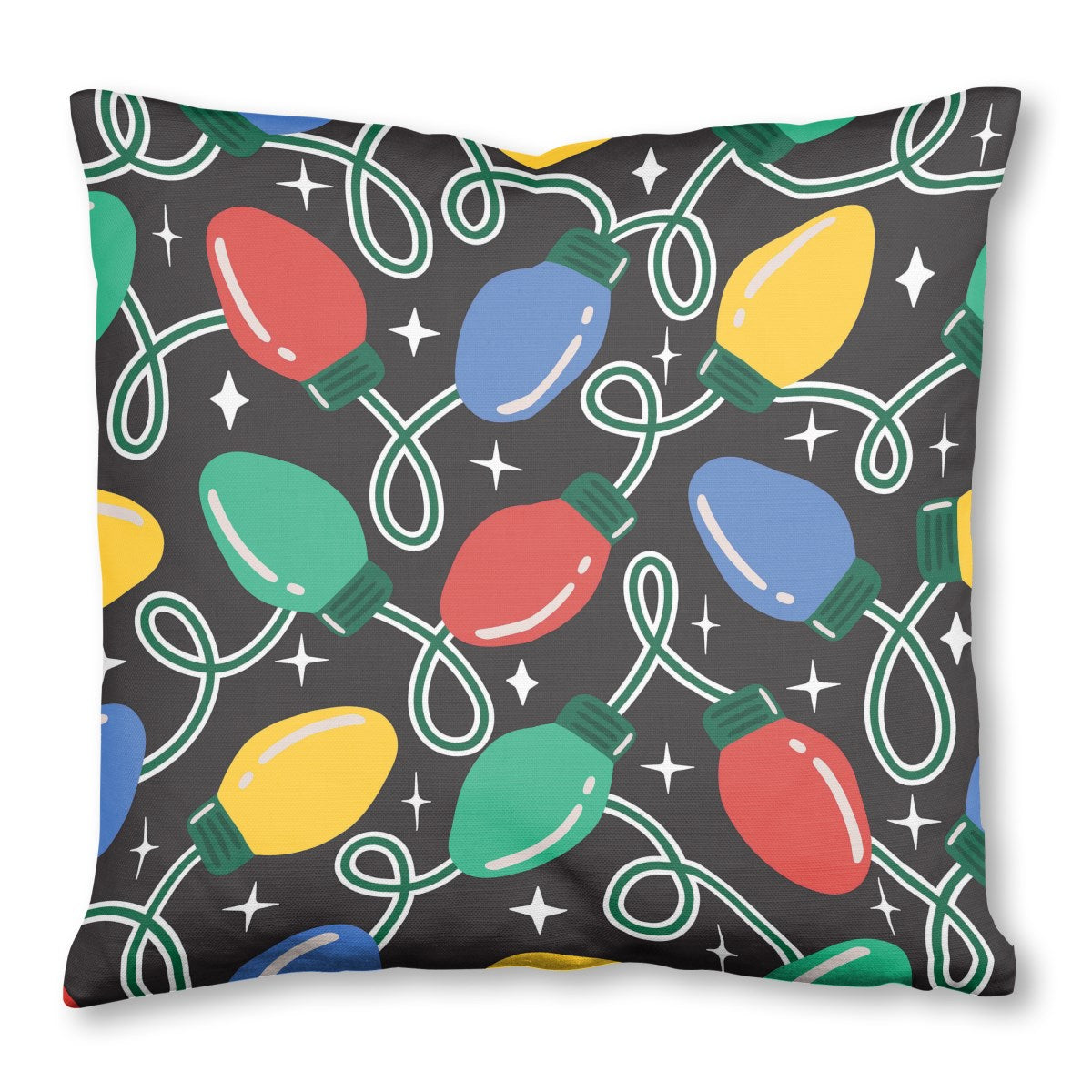 A festive, repeating pattern of colorful Christmas lights. The red, blue, green, and yellow bulbs are strung on looping white wires against a black background. White sparkles add a touch of magic to the cheerful, retro-style holiday design.
