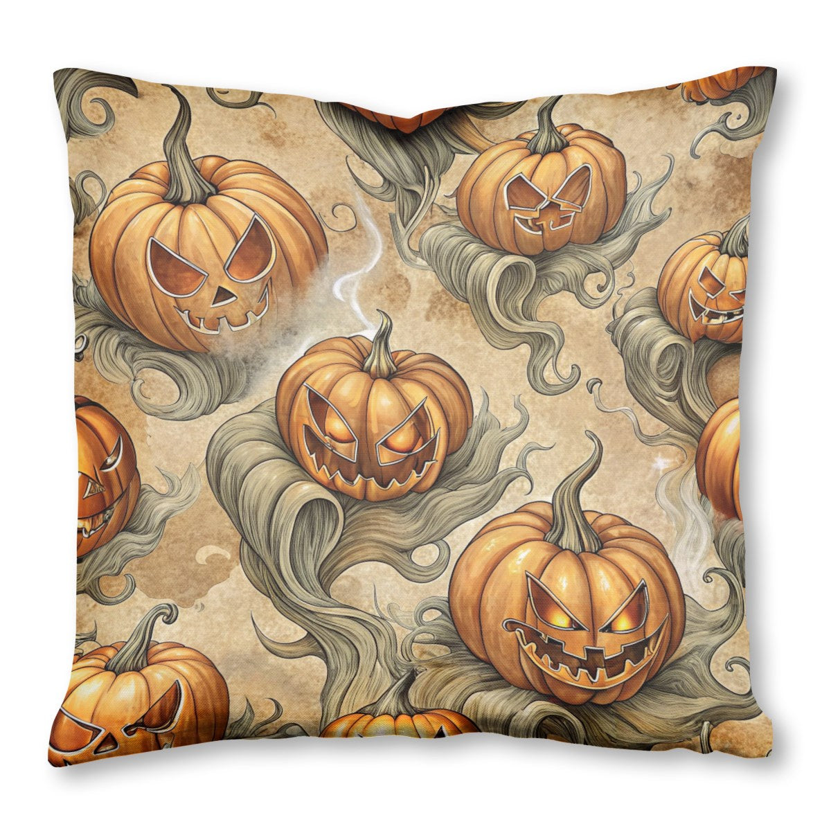 This is a spooky, seamless Halloween pattern of menacing jack-o'-lanterns. Each pumpkin features a unique, glowing, evil face and rests on gnarled, swirling tendrils against a textured, parchment-like background, creating an eerie and festive design.