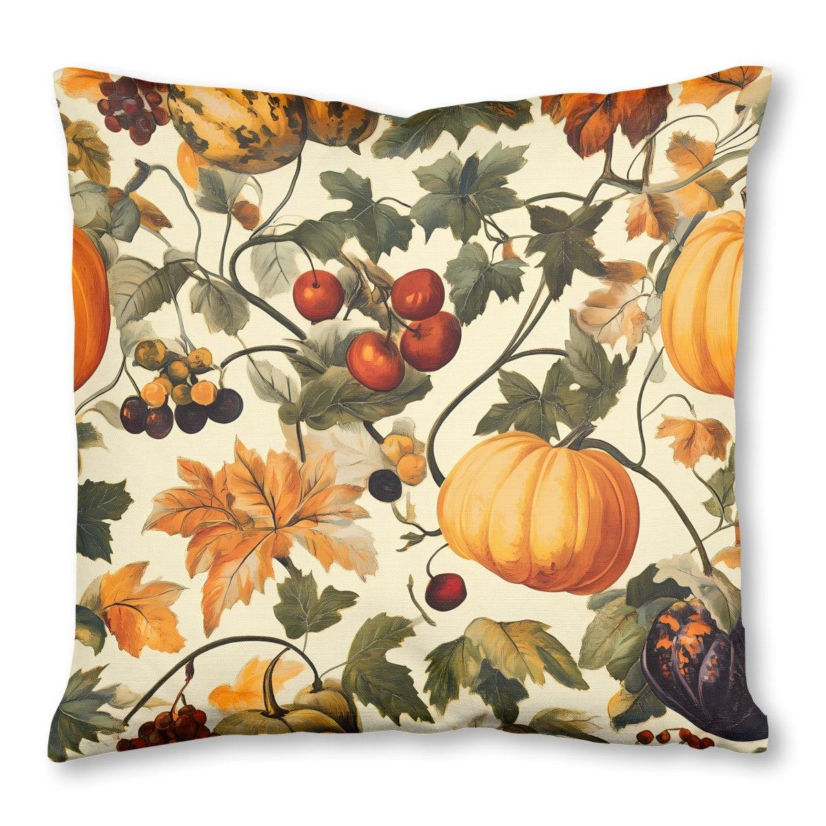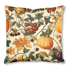 A vintage-style pattern illustrates a bountiful autumn harvest. Orange pumpkins, mottled gourds, grapes, and berries are interwoven with colorful fall leaves and twisting vines against a cream background, evoking a sense of seasonal abundance.