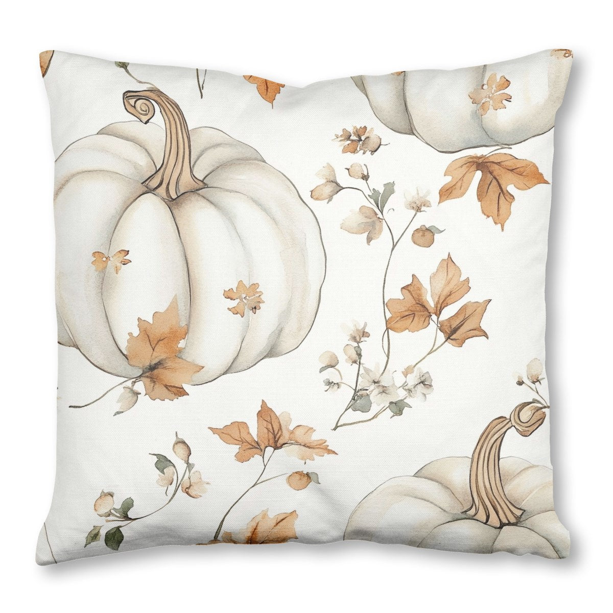 This is a delicate watercolor pattern featuring elegant white pumpkins. The design is interspersed with rustic brown autumn leaves, small white flowers, and trailing vines on a clean background, creating a soft and sophisticated fall aesthetic.