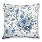This image displays a seamless floral pattern with elegant, watercolor-style illustrations. Various blue flowers, from light to deep indigo, are intertwined with matching leaves and stems on a clean white background, creating a classic and delicate botanical design.