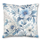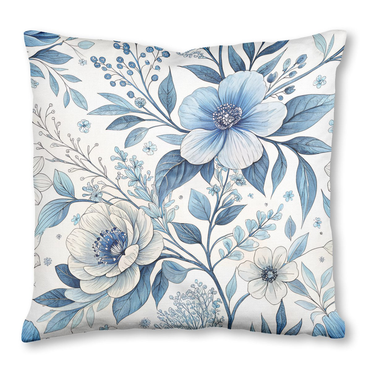 This is a delicate and intricate floral pattern featuring blue and white flowers, leaves, and berries. Rendered in a watercolor and ink-line style against a white background, the design creates a timeless and elegant botanical illustration.