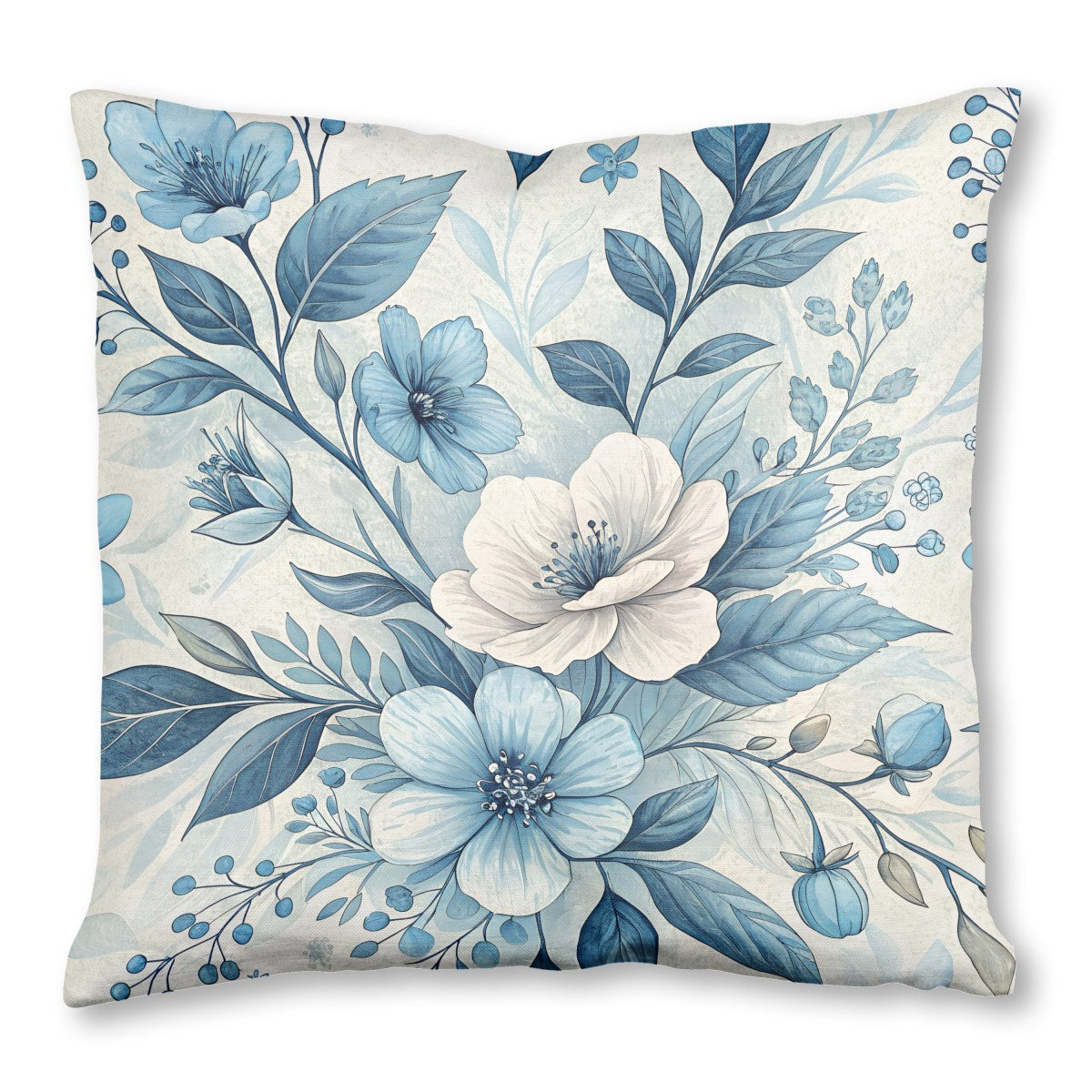 An elegant watercolor-style illustration of a floral pattern. The serene composition features delicate blue and white flowers, deep blue leaves, and small berries intertwined on a light, textured background, creating a classic and tranquil design.