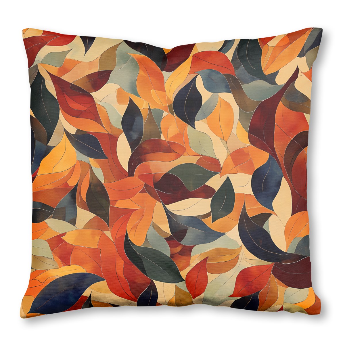 A stylized, abstract pattern of overlapping autumn leaves fills the frame. A rich, warm palette of orange, red, and brown is contrasted by deep blues and dark greens, creating a dynamic, mosaic-like texture reminiscent of stained glass.