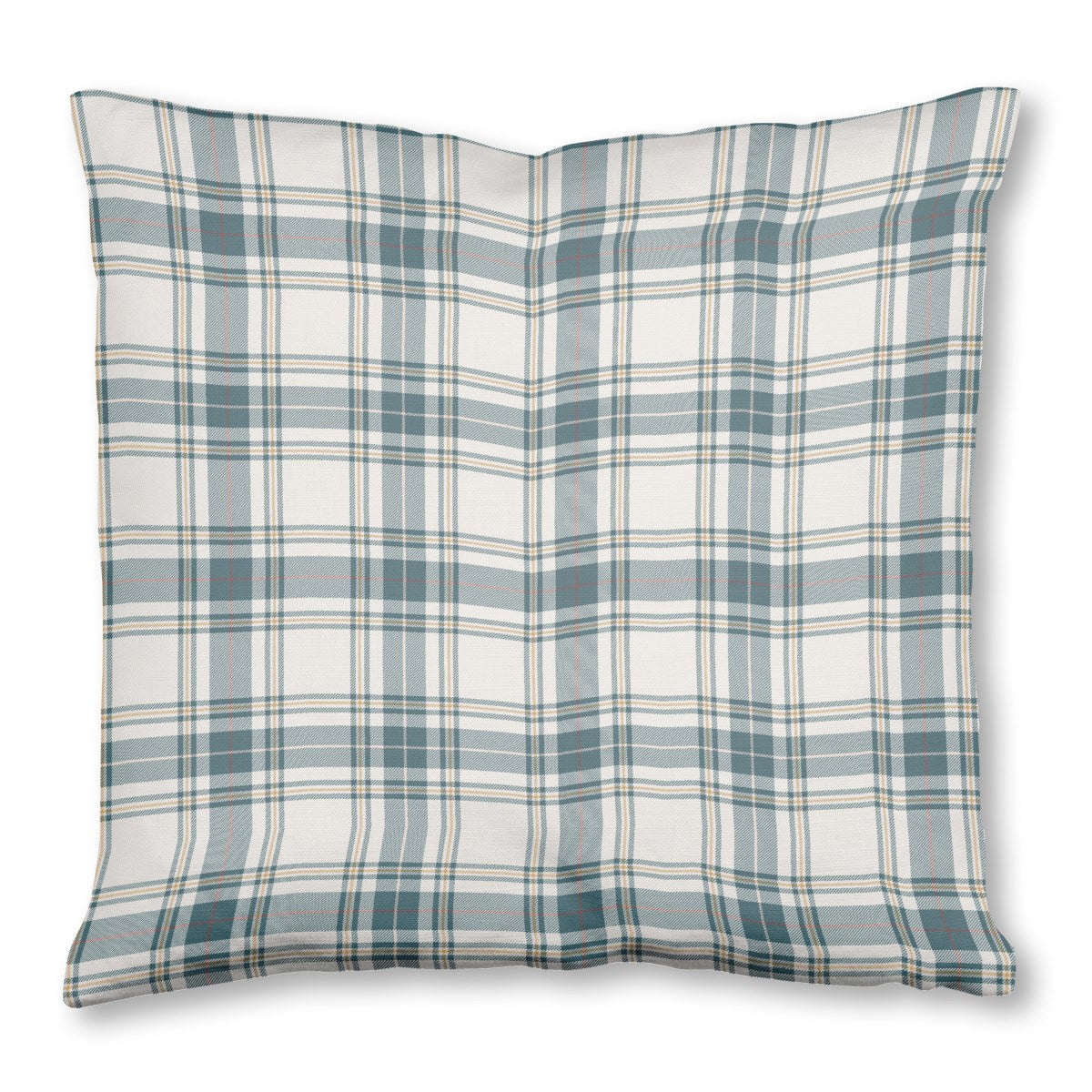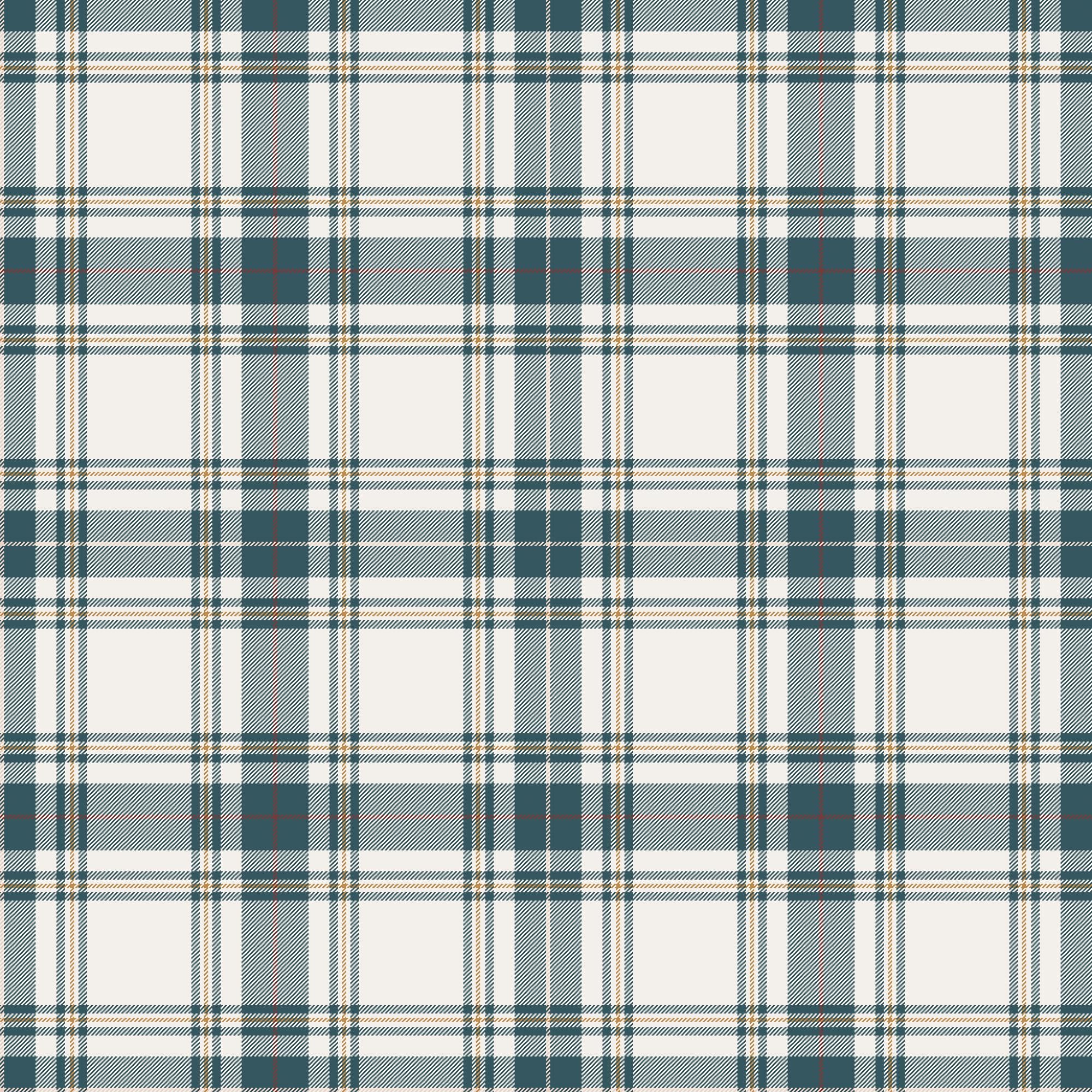 The image shows a seamless pattern of a plaid design. The base is off-white, with intersecting lines of teal, light grey and beige.