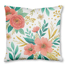 This is a vibrant watercolor floral pattern on a white background. The design features elegant coral-red flowers, teal-green and golden leaves, and delicate gold specks, creating a warm and sophisticated botanical illustration.