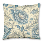 An elegant, traditional floral pattern featuring large, detailed blue and cream peonies. The flowers are interwoven with scrolling grey and blue vines on a dotted, pale yellow background, creating a sophisticated, vintage-inspired design suitable for textiles or wallpaper.