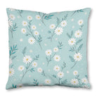This is an illustrated, seamless pattern of delicate white daisies with yellow centers and teal leaves. The charming flowers are scattered across a speckled, light blue background, creating a fresh and whimsical design.