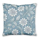 This is a seamless, monochromatic floral pattern featuring stylized white and gray flowers with swirling stems and leaves. Set against a textured, muted blue background, the elegant design has an intricate, embossed quality, giving it a vintage, decorative appearance.