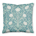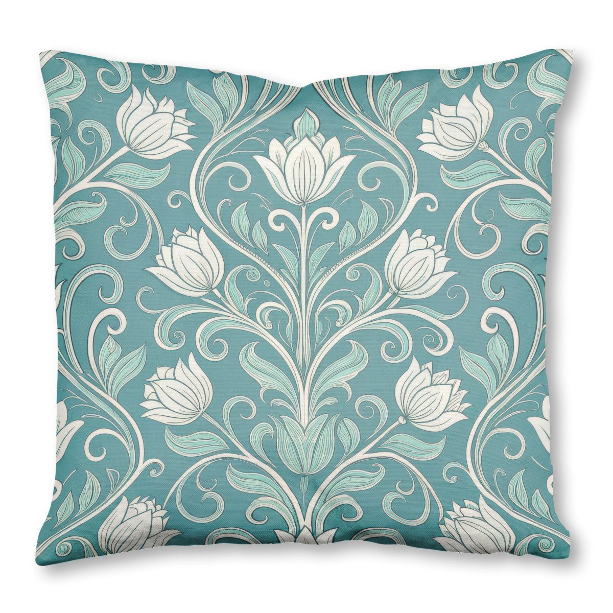 An elegant, symmetrical floral pattern in the Art Nouveau style. Stylized white and mint-green flowers are connected by swirling vines on a rich teal background, creating an intricate and decorative design reminiscent of vintage wallpaper.