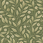 An elegant, Arts and Crafts-style botanical pattern featuring intertwining vines with veined leaves and small cream flowers. The seamless design is set against a dark sage green background, giving it a classic, embossed wallpaper appearance with a subtle three-dimensional quality.