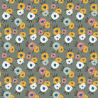 A repeating pattern of stylized flowers in yellow, pink, white, and pale blue on a muted gray-green background. Each flower features a dark blue center with white polka dots, creating a charming and whimsical design with a retro feel.