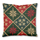 A festive, knitted textile pattern featuring red, green, and dark blue diamonds outlined in gold. Each diamond contains intricate snowflake motifs, evoking the cozy feel of a traditional Christmas sweater or tapestry.