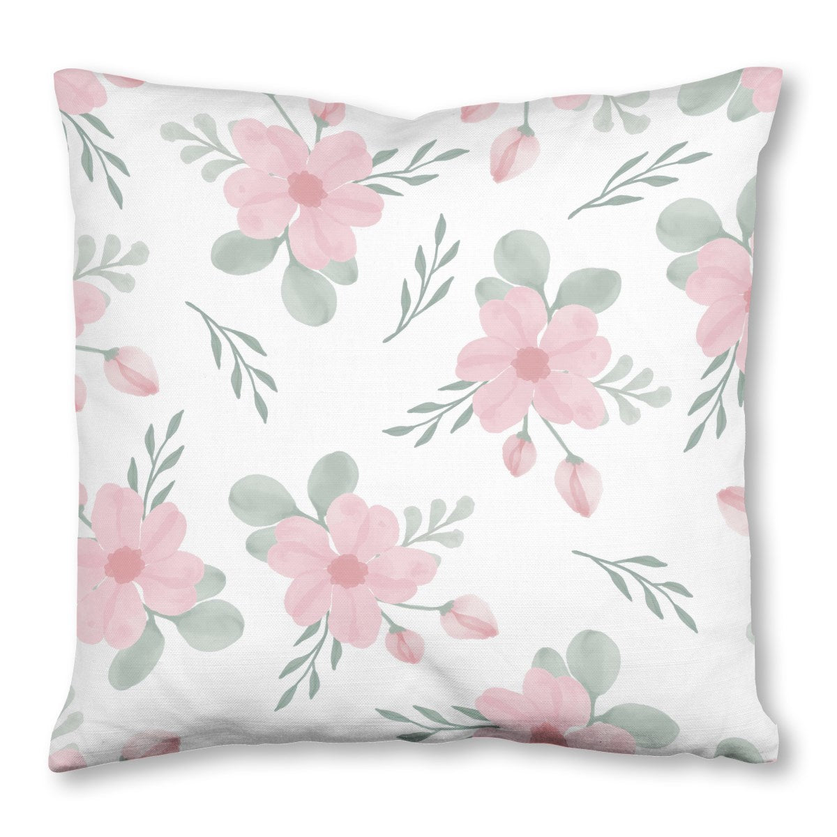 A seamless watercolor pattern featuring delicate pink flowers, buds, and sage green leaves. The gentle floral elements are scattered across a clean white background, creating a soft, elegant, and charming design suitable for textiles or wallpaper.