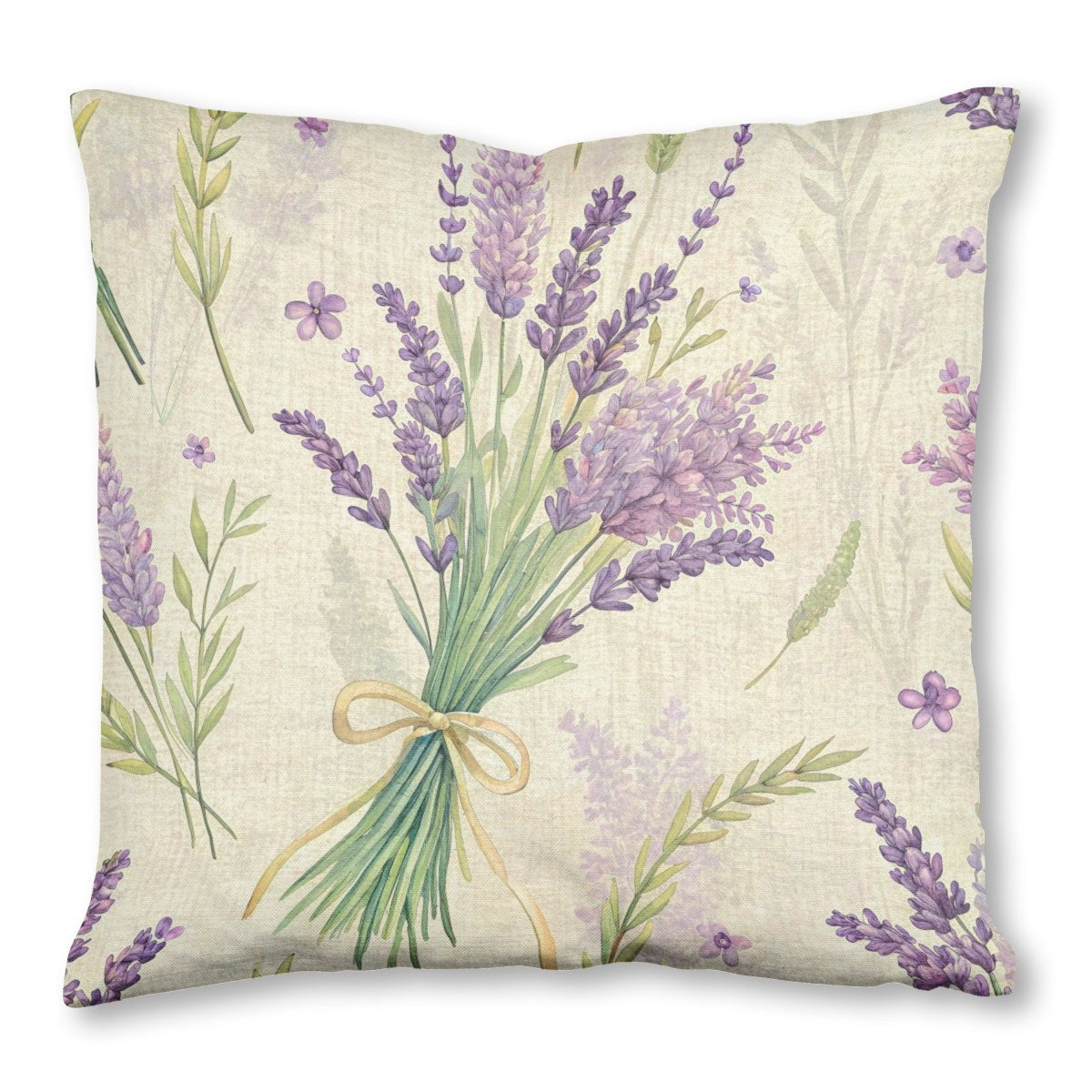 This is a watercolor-style botanical pattern of purple lavender. Bouquets and loose sprigs are scattered across a textured, light beige background. A prominent bunch tied with a yellow ribbon creates a central focus in this charming, rustic design.