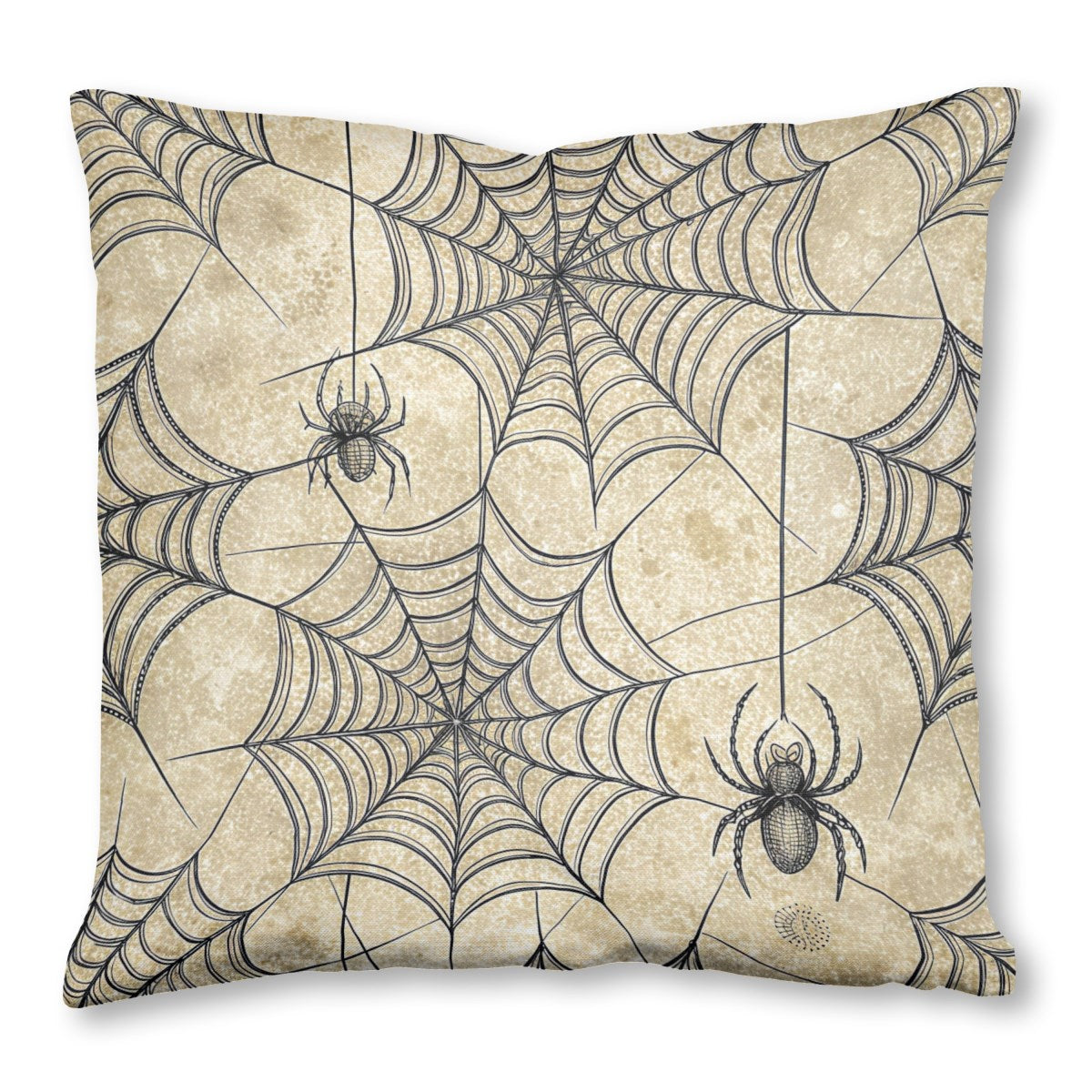 This vintage-style illustration features an intricate, repeating pattern of black spiderwebs on a textured, parchment-like background. Two detailed spiders are present, one crawling on a web and another dangling from a thread, creating a classic spooky or Halloween-themed design.