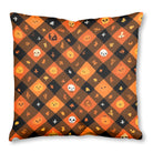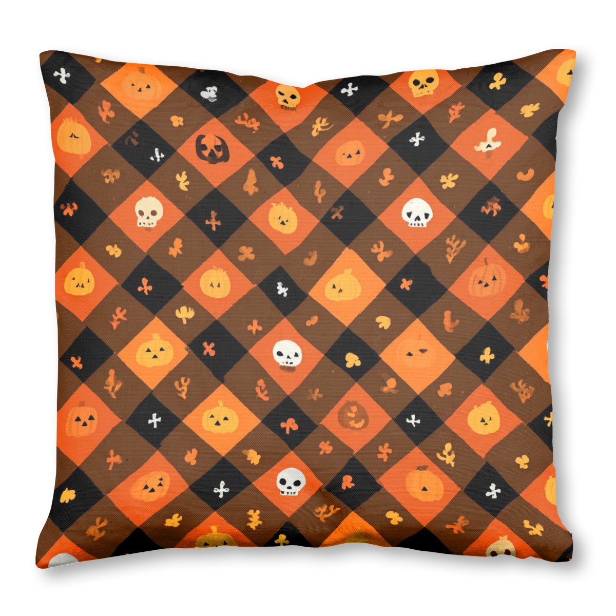 A whimsical, seamless Halloween pattern featuring a diagonal plaid in orange, black, and brown. The design is scattered with hand-drawn, cartoonish skulls, jack-o'-lanterns, and other small autumnal motifs, creating a festive and spooky-cute feel.
