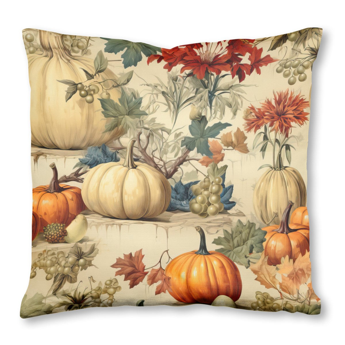 A vintage-style illustration of a bountiful autumn harvest. Orange and pale pumpkins, grapes, and colorful foliage are arranged on tiered stone ledges, creating a rich, decorative pattern with a classic, botanical feel.