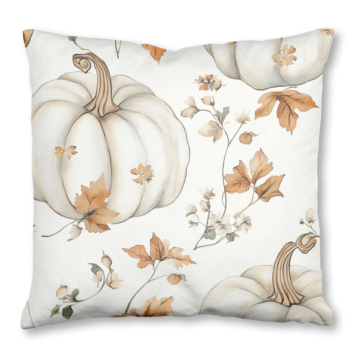This is a delicate watercolor pattern featuring elegant white pumpkins. The design is interspersed with rustic brown autumn leaves, small white flowers, and trailing vines on a clean background, creating a soft and sophisticated fall aesthetic.