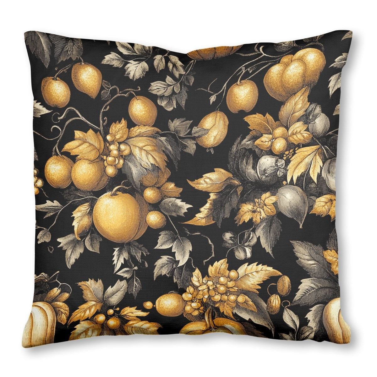A luxurious, vintage-style pattern of autumnal fruits and foliage. Rendered in a detailed engraving style, golden pumpkins, apples, and grapes contrast richly with silver-toned leaves against a dramatic black background, creating an opulent and seamless design.