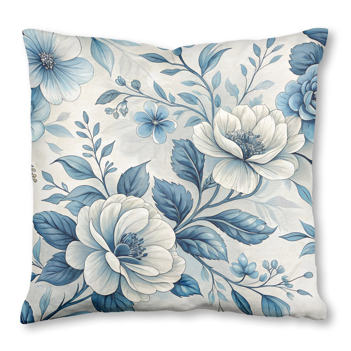 This is an elegant seamless pattern of blue and white flowers. Rendered in a delicate, watercolor-like style, the blossoms and dark blue leaves are set against a light, textured background, creating a classic and serene botanical design.