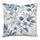 This is an elegant, seamless floral pattern in a classic blue and white palette. Intricately drawn flowers and leaves intertwine over a light, textured background, creating a timeless design reminiscent of vintage botanical illustrations or fine porcelain.