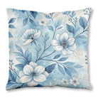This watercolor illustration depicts a delicate floral pattern. White flowers with dark centers and deep blue leaves are intertwined on winding stems. The composition is set against a soft, mottled light blue background, creating a serene and elegant design.