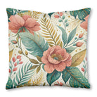 A watercolor-style botanical pattern featuring large, dusty rose flowers and lush tropical leaves in shades of teal, green, and gold. The elegant design is set on a cream background accented with golden speckles, creating a warm and artistic feel.