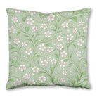 A vintage-style seamless pattern featuring delicate white flowers on gracefully swirling green vines. The intricate, elegant design is set against a soft, muted sage green background with subtle decorative swirls, creating a classic and serene composition.
