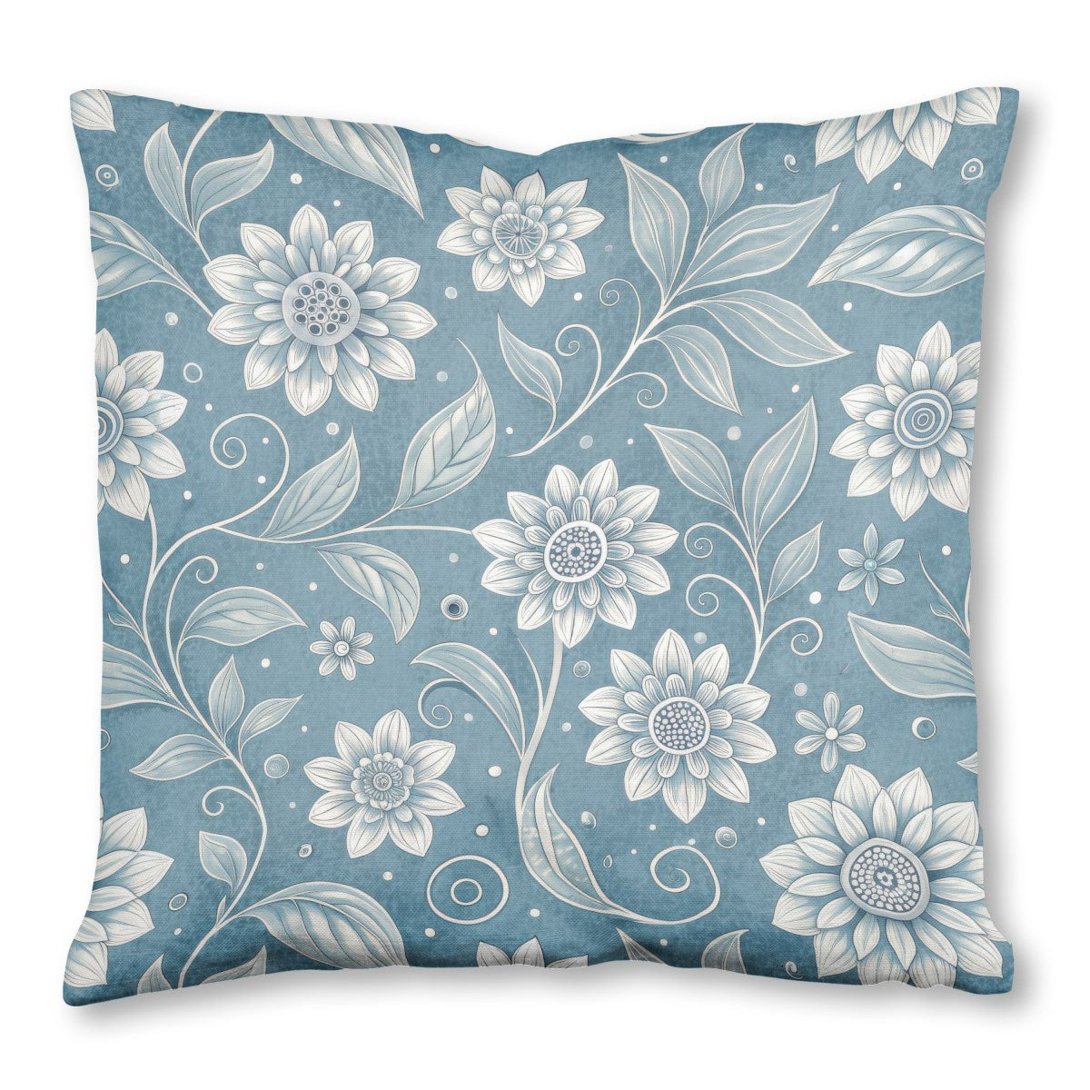 This is a seamless, monochromatic floral pattern featuring stylized white and gray flowers with swirling stems and leaves. Set against a textured, muted blue background, the elegant design has an intricate, embossed quality, giving it a vintage, decorative appearance.