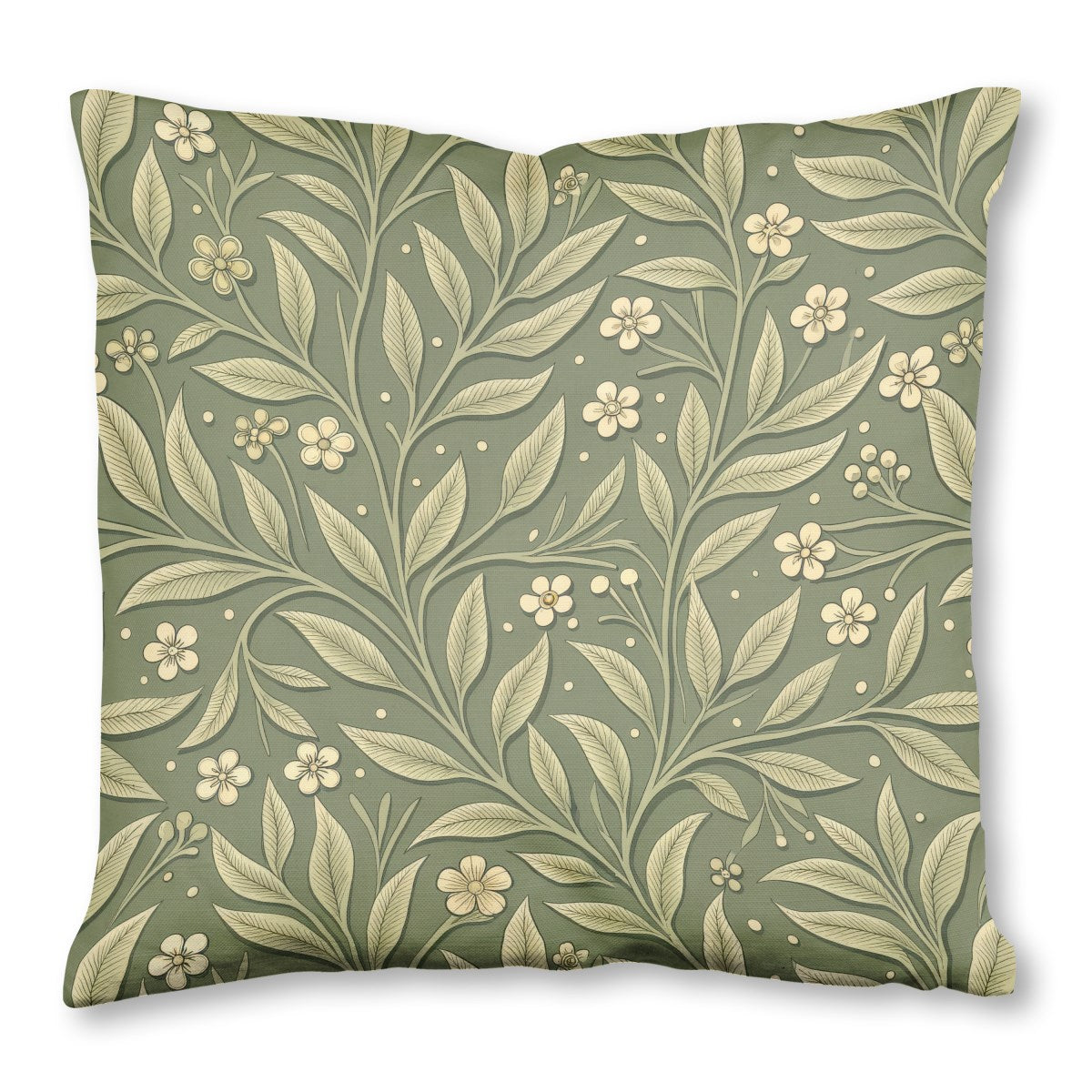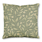 An elegant, Arts and Crafts-style botanical pattern featuring intertwining vines with veined leaves and small cream flowers. The seamless design is set against a dark sage green background, giving it a classic, embossed wallpaper appearance with a subtle three-dimensional quality.