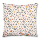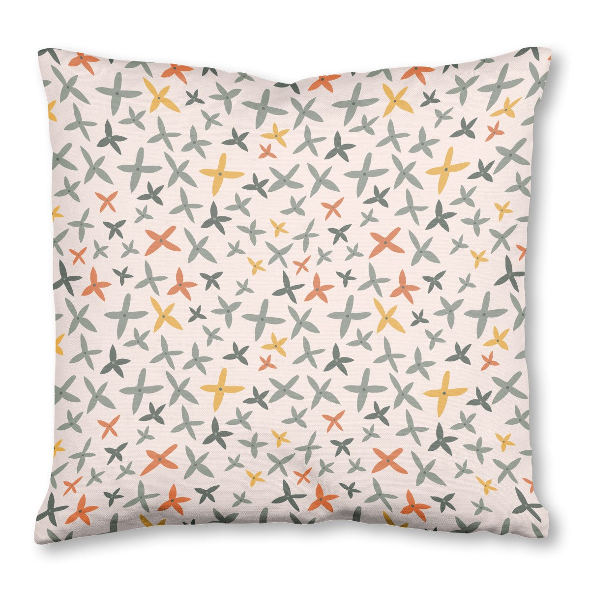 A seamless, modern pattern of stylized four-petaled flowers in varying sizes. The design features a muted, earthy color palette of green, orange, and yellow scattered playfully across a light, off-white background for a whimsical and abstract look.