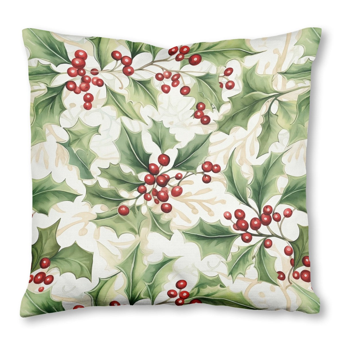 This is a seamless watercolor pattern of festive holly. The design features sprigs with spiky green leaves and clusters of bright red berries, layered over a light background with faint silhouettes of leaves, creating an elegant, classic holiday feel.