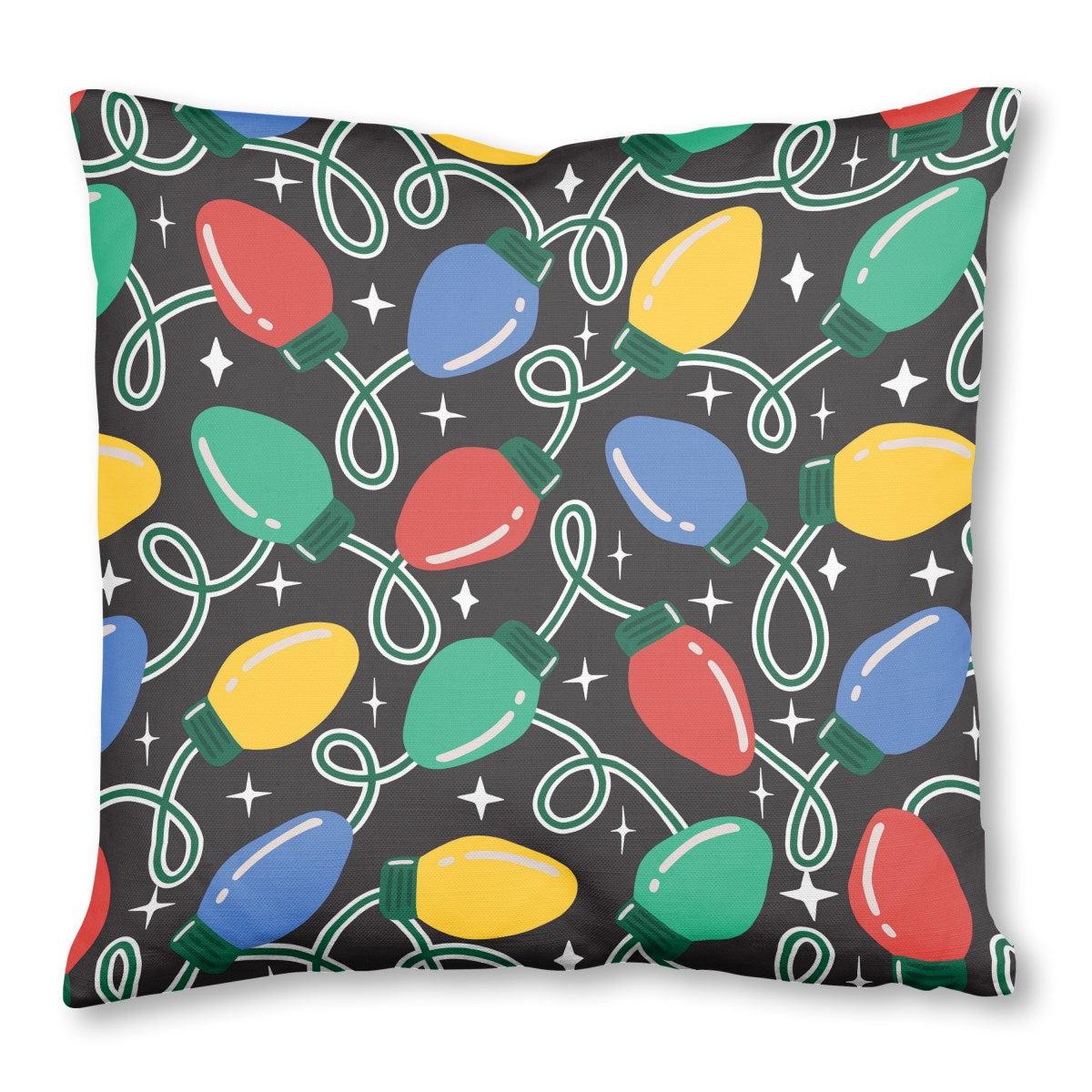 A festive, repeating pattern of colorful Christmas lights. The red, blue, green, and yellow bulbs are strung on looping white wires against a black background. White sparkles add a touch of magic to the cheerful, retro-style holiday design.