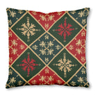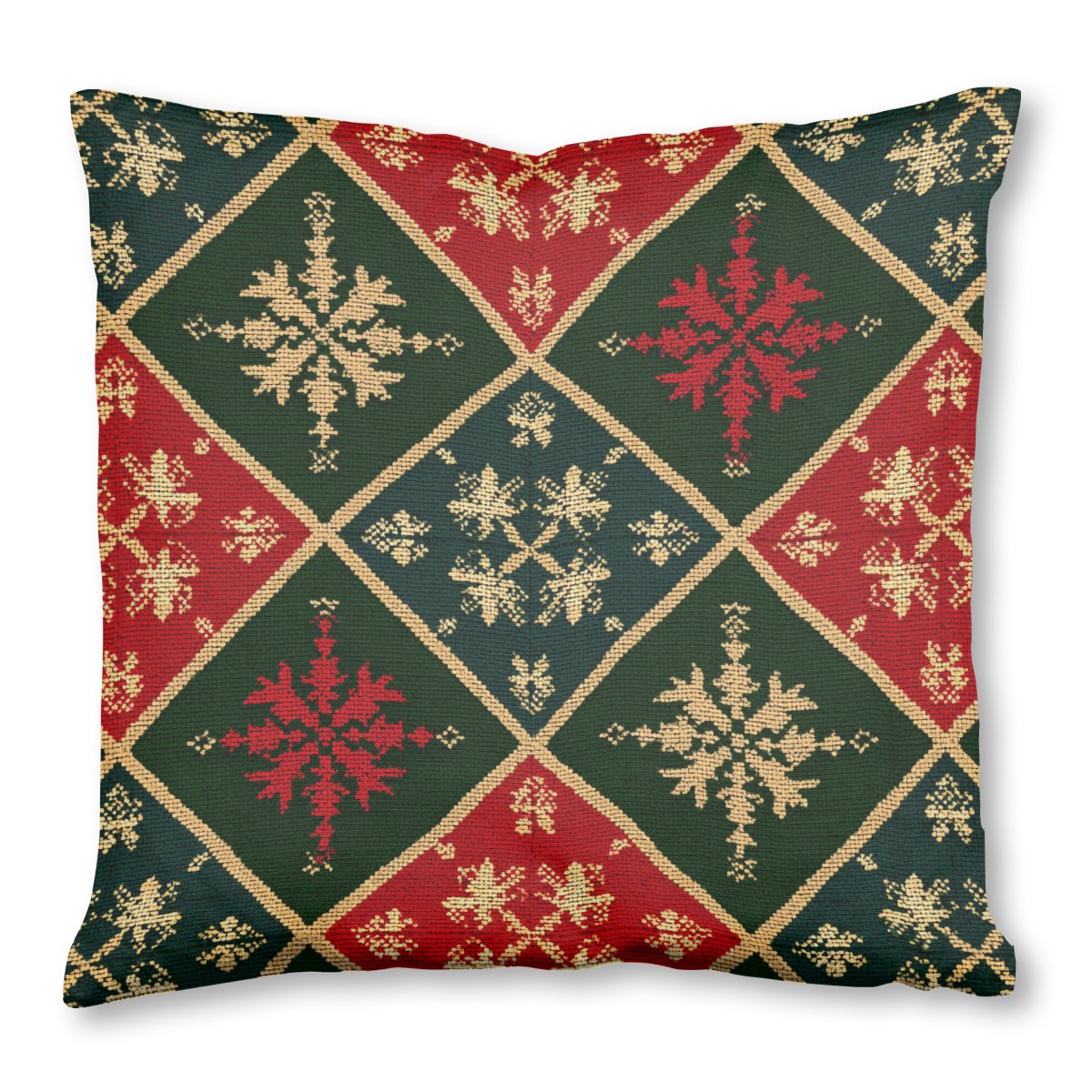 A festive, knitted textile pattern featuring red, green, and dark blue diamonds outlined in gold. Each diamond contains intricate snowflake motifs, evoking the cozy feel of a traditional Christmas sweater or tapestry.