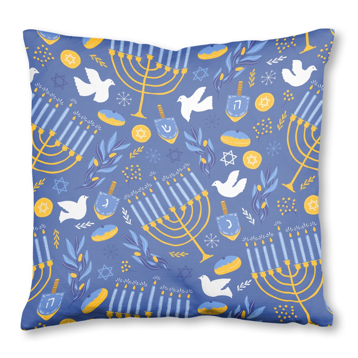 A festive, repeating pattern celebrating Hanukkah on a blue background. The design features illustrations of menorahs, dreidels, sufganiyot (doughnuts), Stars of David, and white doves in a cheerful yellow, blue, and white color palette, creating a joyful holiday theme.