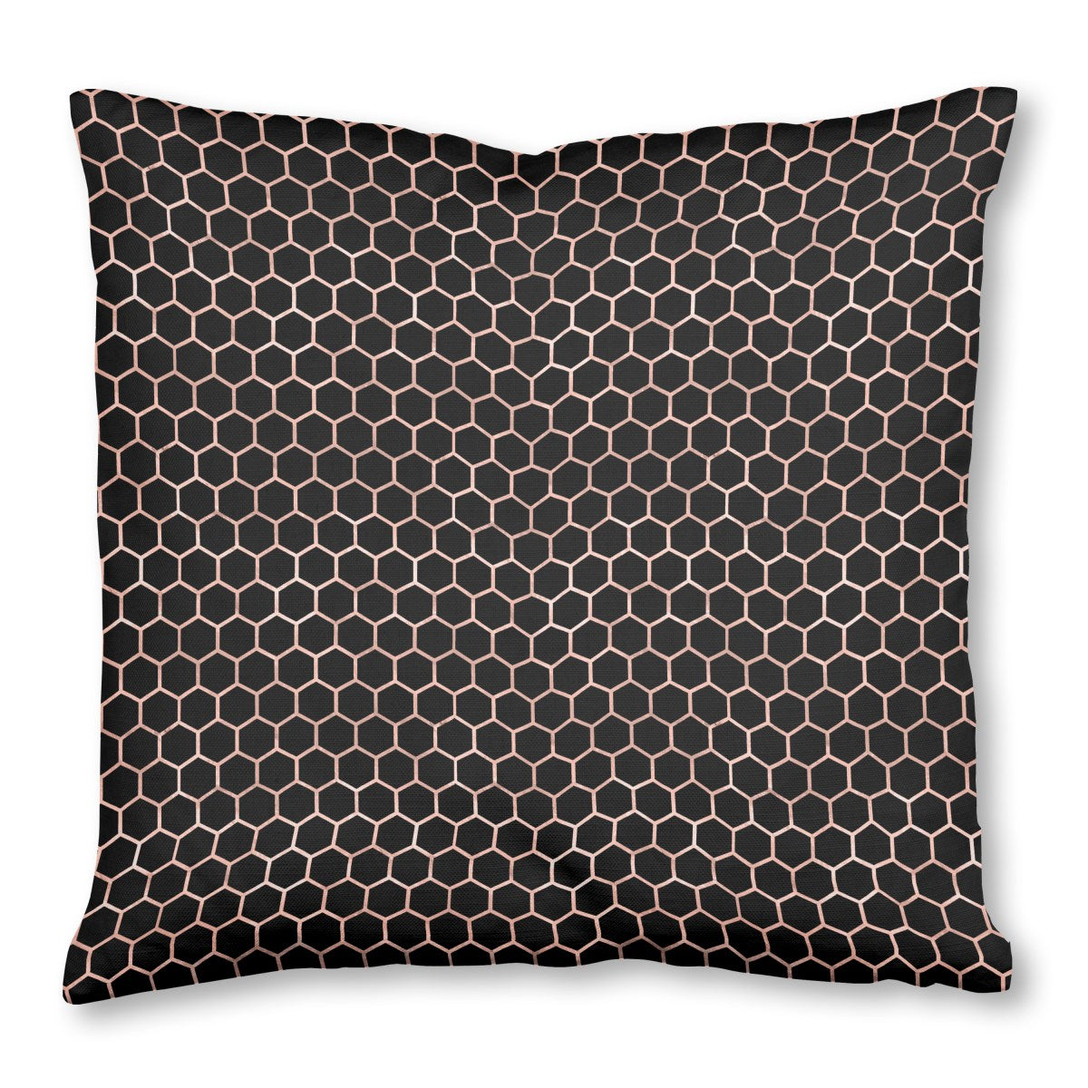 A seamless honeycomb pattern with thin, rose gold metallic lines creates a repeating grid of hexagons. The elegant, geometric design is set against a solid black background, producing a modern and striking contrast.