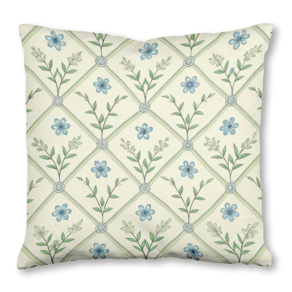 A seamless botanical pattern featuring a light green diagonal trellis on a cream background. The diamond shapes contain alternating motifs of a single blue flower and a leafy green sprig, creating a delicate, vintage-inspired design suitable for wallpaper or fabric.