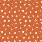 A seamless floral pattern featuring small, simple white flowers with yellow centers. The stylized blossoms are scattered across a warm, terracotta-colored background, creating a charming and minimalist design with a hand-drawn feel.