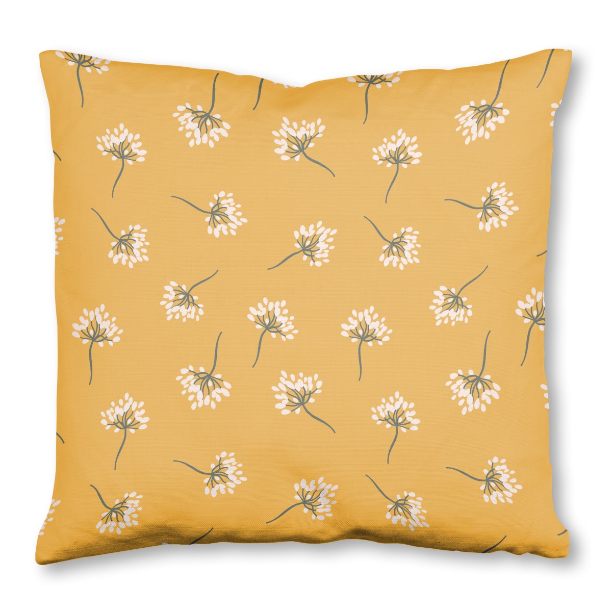 A repeating pattern of stylized white flowers with dark stems scattered across a solid mustard-yellow background. The simple, whimsical floral design has a modern, graphic feel, creating a cheerful and charming aesthetic.