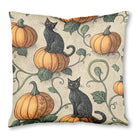 A vintage-style seamless pattern features black cats with glowing orange eyes perched on pumpkins. Swirling green vines and leaves connect the elements on a textured, light background, creating a classic Halloween-themed illustration with a slightly spooky feel.