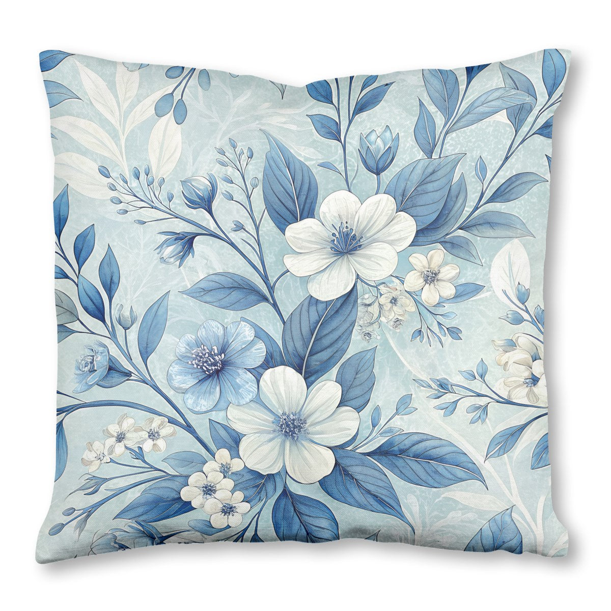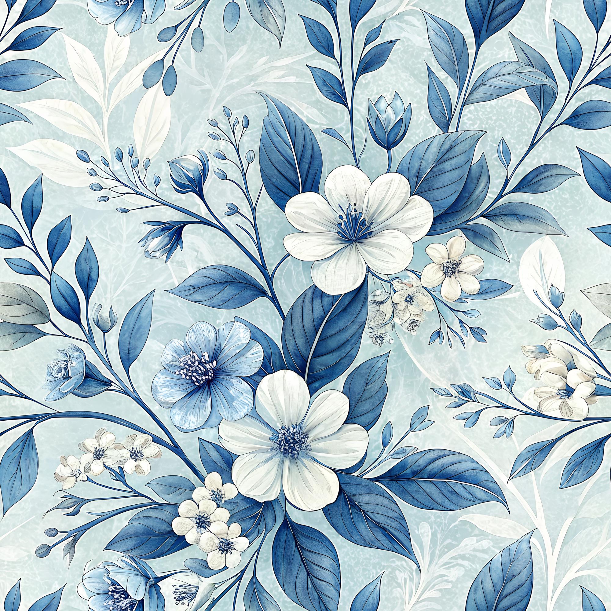 An elegant floral pattern featuring intricate white and blue blossoms with deep blue leaves. The delicate arrangement is set against a soft, textured, light blue background, creating a serene and classic design with a watercolor-like feel.